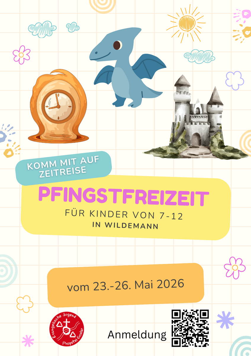 Hast du Lust über das lange Pfingstwochenende auf eine ganz besondere Reise zu gehen? Dann steig ein in unsere Zeitmaschine. Gemeinsam reisen wir durch verschiedene Zeitepochen: Wir entdecken, wie Menschen früher gelebt haben, wagen einen Blick in die Zukunft und erleben aufregende Abenteuer im Hier und Jetzt. Dich erwarten spannende Geschichten, lustige Spiele, kreative Angebote und ganz viel Zeit zum Lachen, Staunen und Freundschaften schließen.